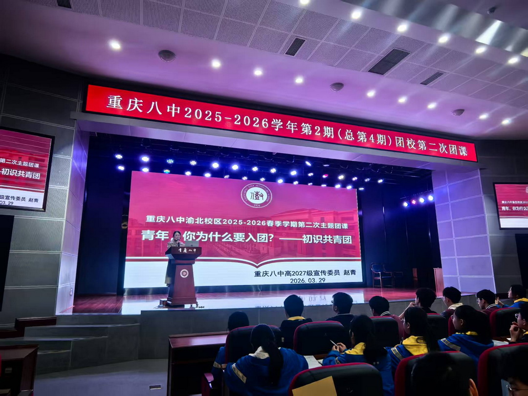 2026年3月29日,重庆八中举行了2025-2026学年第2期(总第4期)团校第二次主题团课。本次团课以“青年,你为什么要入团?——初识共青团”为主题,由高2027届宣传委员赵青主讲,校区内众多学生积极参与。