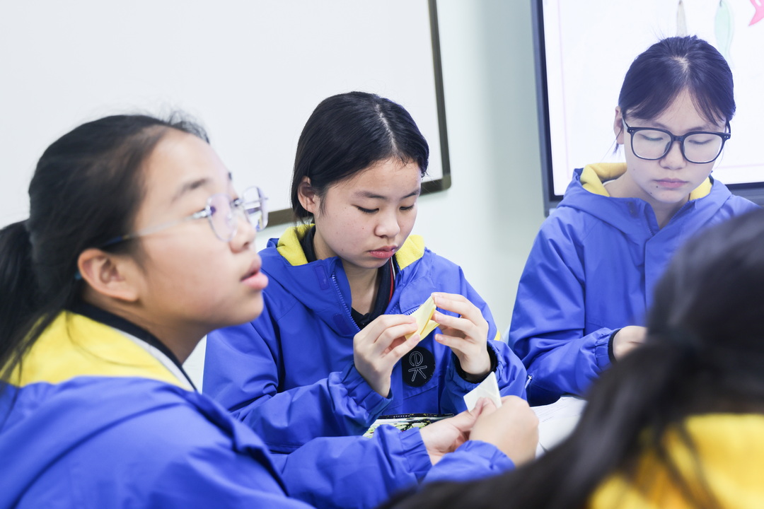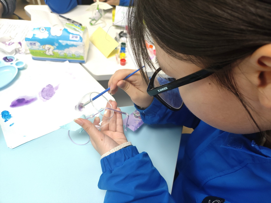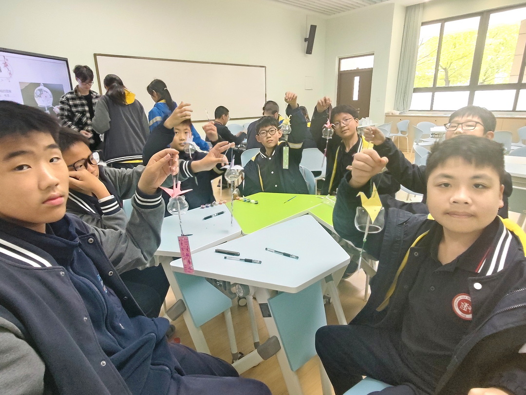 在核心创作环节,学生依次完成了“心情风铃”的各个部分。他们首先在长条形卡片上写下自己曾经历的积极情绪体验,将温暖的记忆转化为可视化的文字;随后,在谢老师的现场演示与同伴互助中,学生们折叠出一只只小巧的千纸鹤,承载着新学期的心愿与期许。最后,学生在透明的玻璃罩上自由绘制代表“开心与幸福”的图案——太阳、云朵、笑脸、问号……每一笔都是内心情绪的具身表达。所有的作品通过细绳串联成风铃,成为“独立个体,共同发声”的象征。