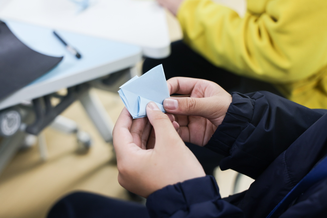 活动以“一张纸的变形记”热身环节拉开序幕。学生通过选择代表自己开学心情的彩纸入场,并在小组内以“班级+姓名”的形式彼此认识,在轻松的氛围中完成破冰与联结。谢老师引导学生用色彩表达当下的情绪状态,为后续的深入体验奠定基础。