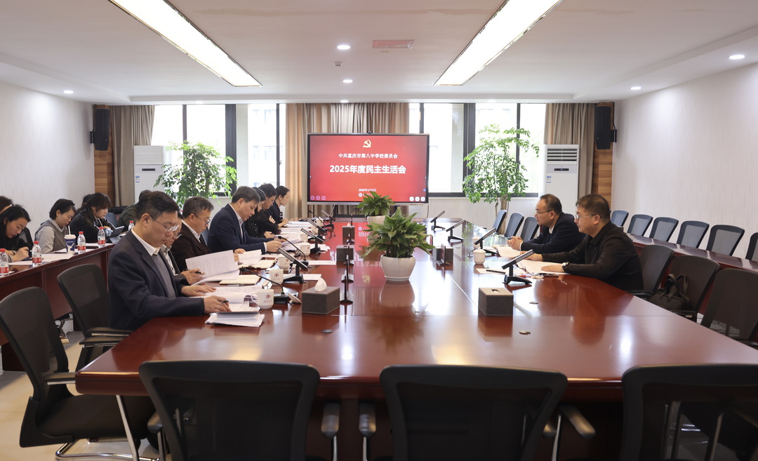 2026年4月3日,中共重庆市第八中学校委员会2025年度民主生活会顺利举行。本次会议以“深入学习贯彻习近平新时代中国特色社会主义思想,全面贯彻落实党的二十届四中全会精神,以打攻坚战、持久战的决心和恒心,锲而不舍落实中央八项规定精神,推进作风建设常态化长效化,以最坚决的态度、最扎实的作风、最严格的要求、最有力的举措配合市委抓好中央巡视反馈意见有关问题整改落实,以优良作风凝心聚力、真抓实干,加快打造现代化新重庆建设重要增长极和动力源,努力在现代化新重庆建设中展现更大担当、作出更大贡献”为主题。区教委督导组杜术林同志、岳茂林同志莅临指导,杜术林同志作点评讲话。我校班子成员周迎春、付英、张泽勇、梅家烨、曾奇、朱艳、王怒涛参会,党委书记周迎春主持会议。