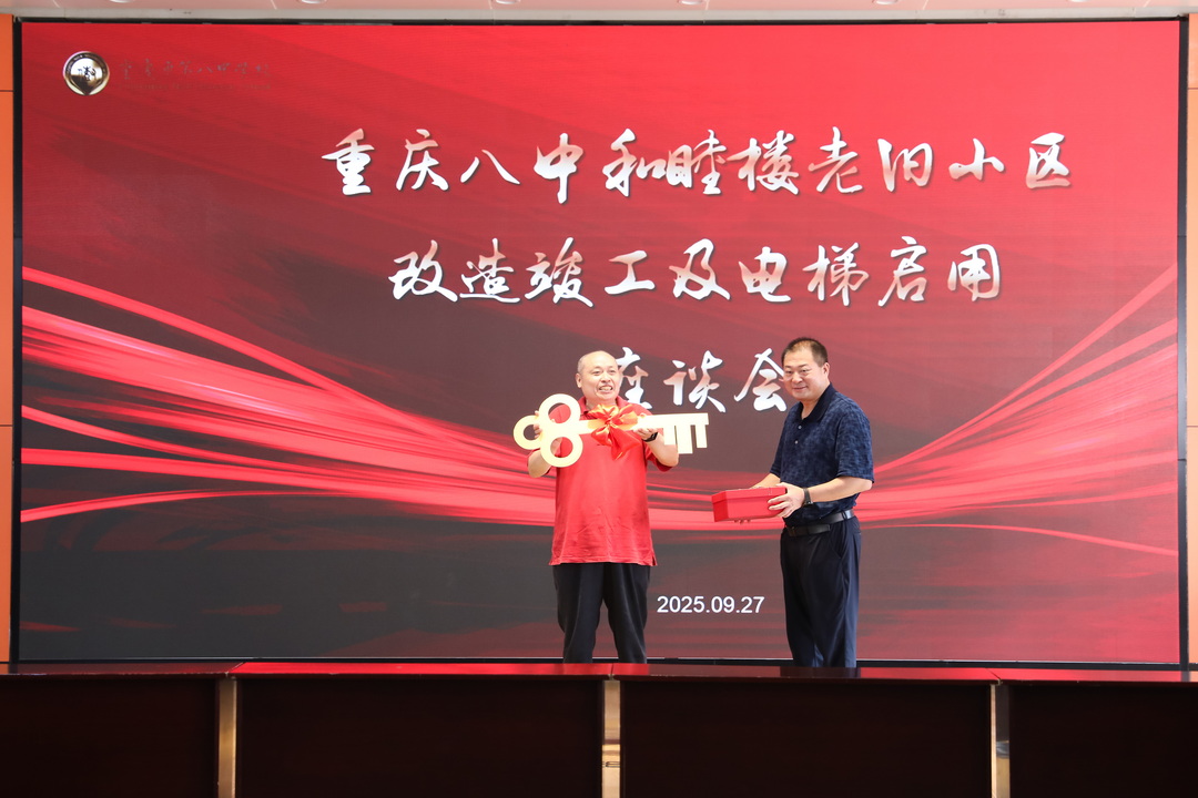 9月27日,重庆八中和睦楼老旧小区改造峻工及电梯启用座谈会在沙坪坝校区科技楼六楼报告厅隆重举行,现场同步开展钥匙交付与锦旗赠送仪式。出席现场的领导有沙坪坝区政府副区长钟文、区规资局局长沈艳丽、区城管局副局长程琼梅、区住建委副主任王亚威、区市民服务和营商环境促进中心主任陈波、小龙坎街道党工委书记江涛峰。出席本次活动的还有沙坪坝区财政局、市场监管局、嘉新社区相关领导,相关建设公司,和睦楼业主代表以及重庆八中党委书记周迎春、校长卿知人、副校长梅家烨、总务处主任赵呈学、行办副主任赵心怡。会议由卿知人校长主持。