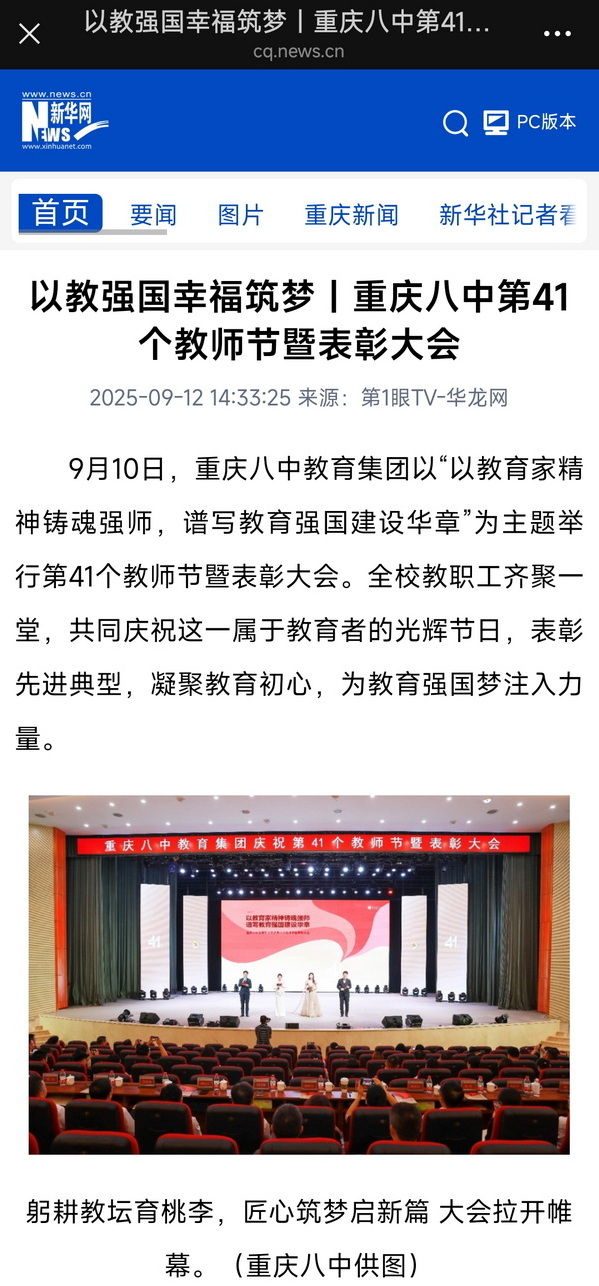 9月10日,重庆八中教育集团以“以教育家精神铸魂强师,谱写教育强国建设华章”为主题举行第41个教师节暨表彰大会。全校教职工齐聚一堂,共同庆祝这一属于教育者的光辉节日,表彰先进典型,凝聚教育初心,为教育强国梦注入力量。