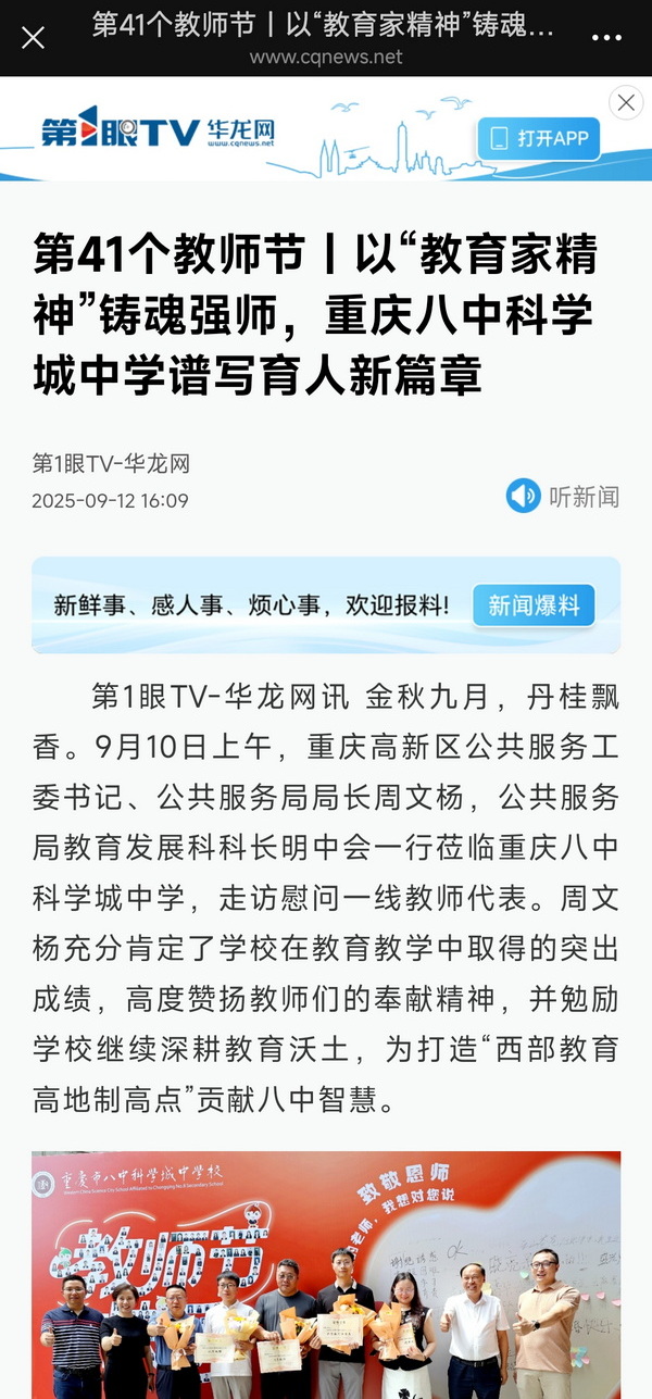 第1眼TV-华龙网讯 金秋九月,丹桂飘香。9月10日上午,重庆高新区公共服务工委书记、公共服务局局长周文杨,公共服务局教育发展科科长明中会一行莅临重庆八中科学城中学,走访慰问一线教师代表。周文杨充分肯定了学校在教育教学中取得的突出成绩,高度赞扬教师们的奉献精神,并勉励学校继续深耕教育沃土,为打造“西部教育高地制高点”贡献八中智慧。
