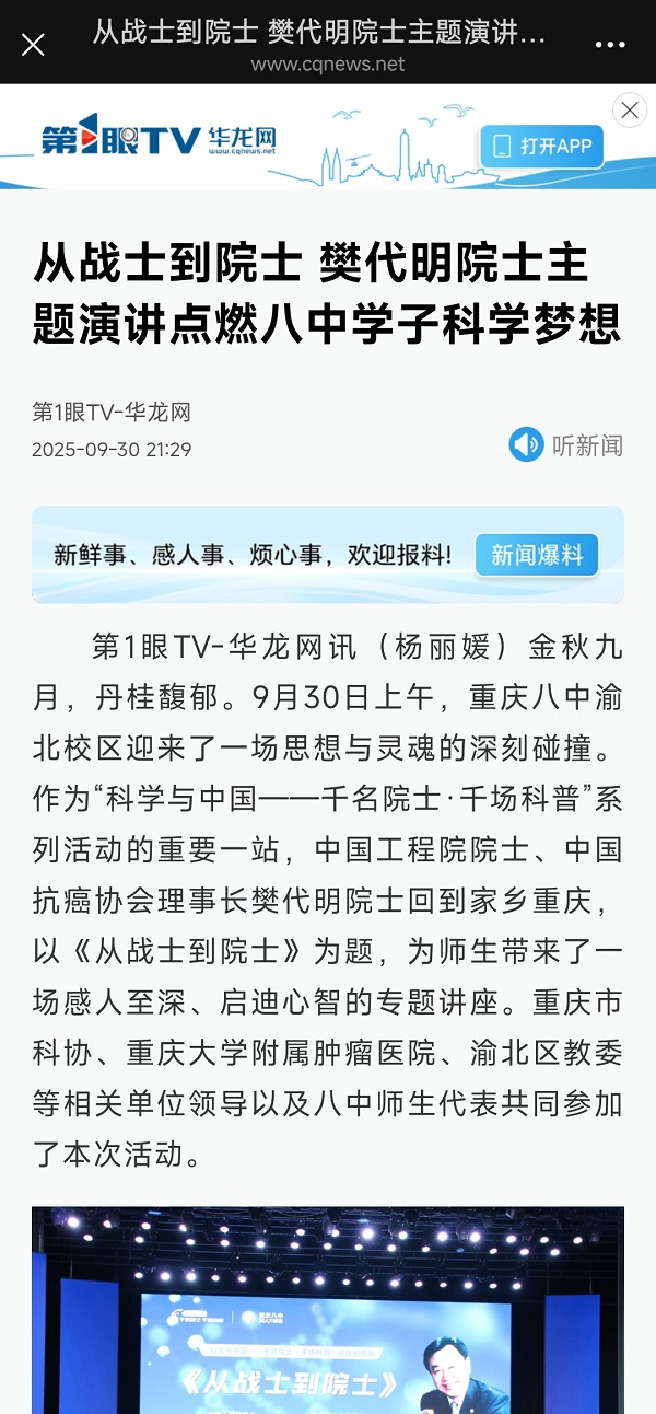 第1眼TV-华龙网讯(杨丽媛)金秋九月,丹桂馥郁。9月30日上午,重庆八中渝北校区迎来了一场思想与灵魂的深刻碰撞。作为“科学与中国——千名院士·千场科普”系列活动的重要一站,中国工程院院士、中国抗癌协会理事长樊代明院士回到家乡重庆,以《从战士到院士》为题,为师生带来了一场感人至深、启迪心智的专题讲座。重庆市科协、重庆大学附属肿瘤医院、渝北区教委等相关单位领导以及八中师生代表共同参加了本次活动。