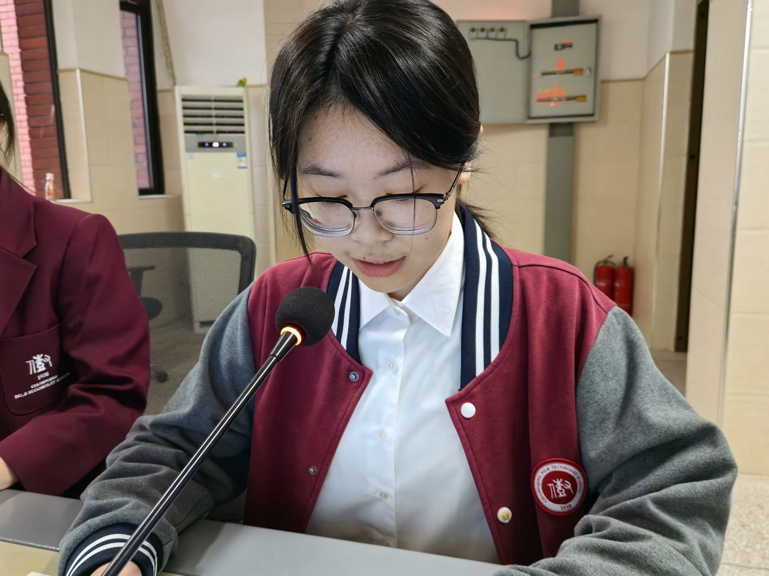 朝会现场,高2027级3班的马伊诺同学发言将视角聚焦于校园日常的细微之处。马伊诺讲到“中国红,我们总想起国旗飘扬、英雄事迹,但在教室门口、操场角落,藏着更贴近我们的‘红色’”。她分享道,同学离开教室时随手按下的关灯按钮,弯腰拾起的一片纸屑,运动场上为队友拼尽全力的助威呐喊,这些看似平凡的举动,是节约、是责任、是团结,更是“八中红”最鲜活的底色,请让我们用小行动守护的每一份美好,都是在为‘中国红’添砖加瓦。