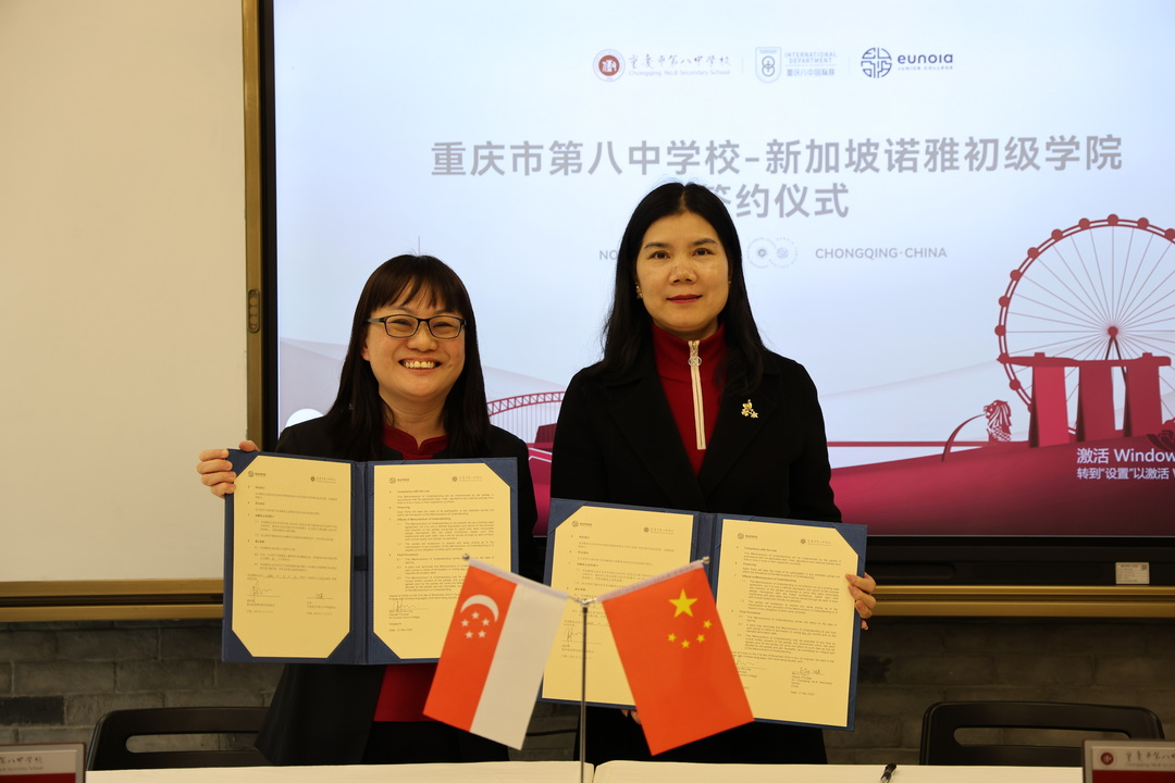 师生的交流互动结束后,两校领导来到国际部汉语教室举行谅解备忘录续签仪式。仪式伊始,主持人回顾了两校自2016年因共同的教育情怀“乐育天下”而结缘,历经九载春秋,从线下互访到云端相连,情谊愈发深厚的交往历程。在热烈的掌声中,重庆市第八中学校副校长付英女士与新加坡诺雅初级学院副院长潘家铃女士分别致辞。她们一致肯定了过去九年合作取得的丰硕成果,并表达了对未来在更广领域、更深层次开展交流与合作的美好愿景与坚定信心。