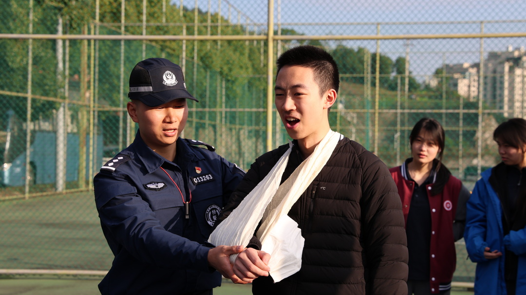 在随后开展的室外实战训练环节中,阳光明媚、微风轻柔,同学们在操场上跟随特警进行徒手防卫、基础急救技术、AED使用要点、情景模拟应对等多项实践训练。警官们手把手示范要领,学生们分组练习,在一次次实操中提升了警觉性与身体反应能力。许多同学表示:“第一次觉得自我保护能力是可以通过训练真正掌握的。”