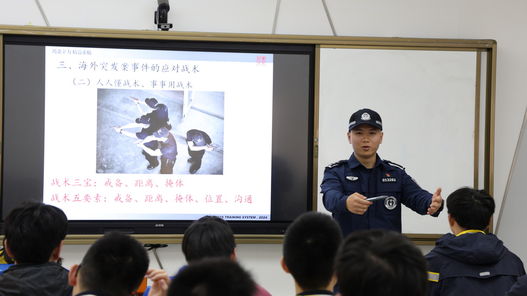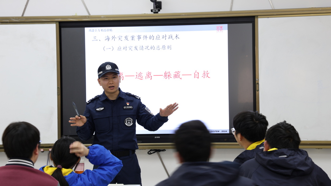 在海外安全形势与风险识别模块中,特警结合不同国家和地区的社会治安特点,讲解了住宿安全、出行安全、社交风险等关键问题。同学们在互动问答中纷纷提出自己的疑惑,现场氛围积极而专注。