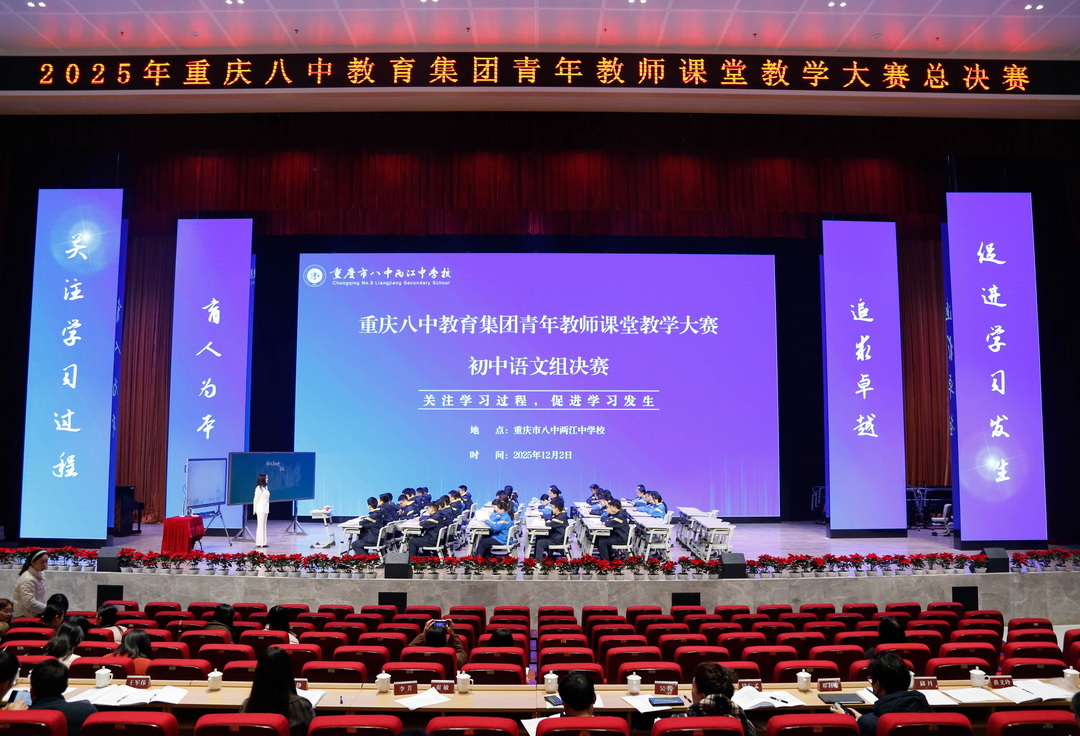 近日,历经层层选拔,重庆八中教育集团2025-2026学年度青年教师课堂教学大赛总决赛圆满落幕。赛事于2025年11月24日至12月5日(第13-14周)举办,以“关注学习过程,促进学习发生”为主题,通过“课堂展示、说课析理、评课研讨、名师讲座”四段式流程,在15个分赛场呈现14个学科38堂精品课与15场知识分享,为集团校教师献上高质量教学盛宴。