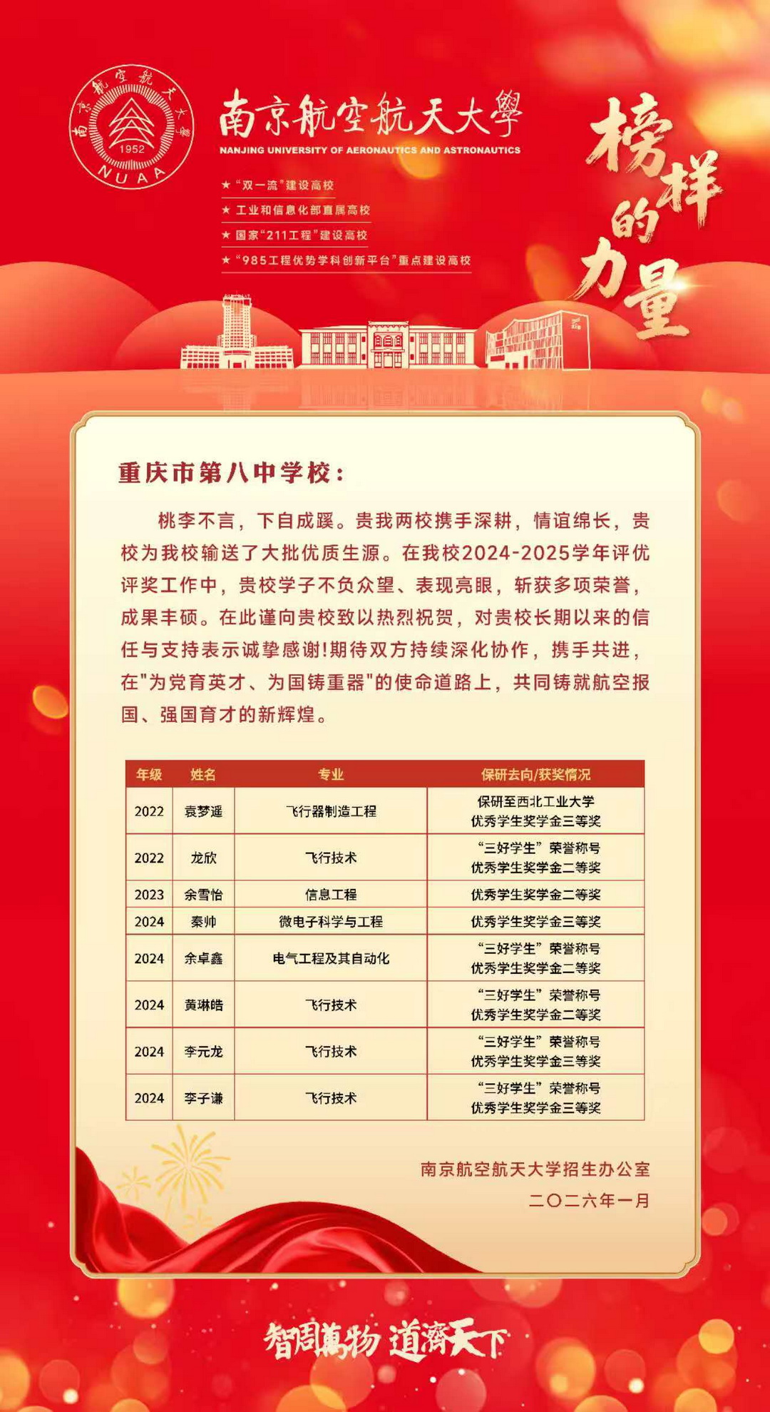 南京航空航天大学发来喜报,祝贺我校优秀毕业生在该校 2024-2025 学年评优评奖中斩获多项荣誉!感恩携手同行,期待两校深耕协作,共育栋梁之才,共铸航空强国新辉煌。