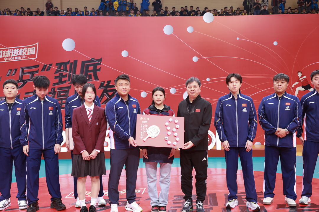 现场最受期待的趣味互动环节,将现场气氛一次次推向高潮,成为整场活动的亮点所在。梁靖崑、向鹏主动与我校学生、嘉宾组队,携手开展“大小台”趣味对抗,新颖独特的赛制打破常规,国手们的灵活应变与学子们的奋力拼搏相映成趣,每一次精彩交锋都引得现场掌声雷动、喝彩不断;周启豪、徐瑛彬则兴致勃勃地体验了由我校学生自主研发的AI智能乒乓游戏,这款深度融合AI智能与国乒精神内核的作品,不仅充满趣味性,更生动展现了我校“科技+体育”的创新育人成果,充分彰显了八中学子的创新思维与实践能力。随后,王楚钦、陈垣宇等国乒队员轮番上阵,与我校学生、嘉宾展开一对一、一对多的互动切磋,每一次精准发球、每一次默契对拉,都点燃了全场师生的热情,赛场内外掌声、欢呼声、呐喊声交织在一起,汇成了欢乐的乒乓交响乐。此外,活动特别设置的有奖竞猜环节更添惊喜,国乒主教练王皓及教练员孙逊亲自向现场观众提问,围绕国球知识、乒乓规则展开互动,对答对的幸运观众送上专属礼品,并亲切合影留念,拉近了国乒团队与我校师生的距离,让现场氛围暖意融融、欢乐加倍。活动现场更有暖心一幕温情上演。来自我校融合教育黔江集团学校的高二学生张欣悦,带着以土家族非遗西兰卡普为元素创作的水彩画来到现场,由学校党委书记周迎春代表学校赠予国乒团队,以此表达对国乒队员的崇敬与祝福。作为回礼,国乒队员们为我校送上亲笔签名的乒乓球,写下对八中学子的美好期许,让非遗文化与国球精神在双向奔赴中碰撞出别样火花。