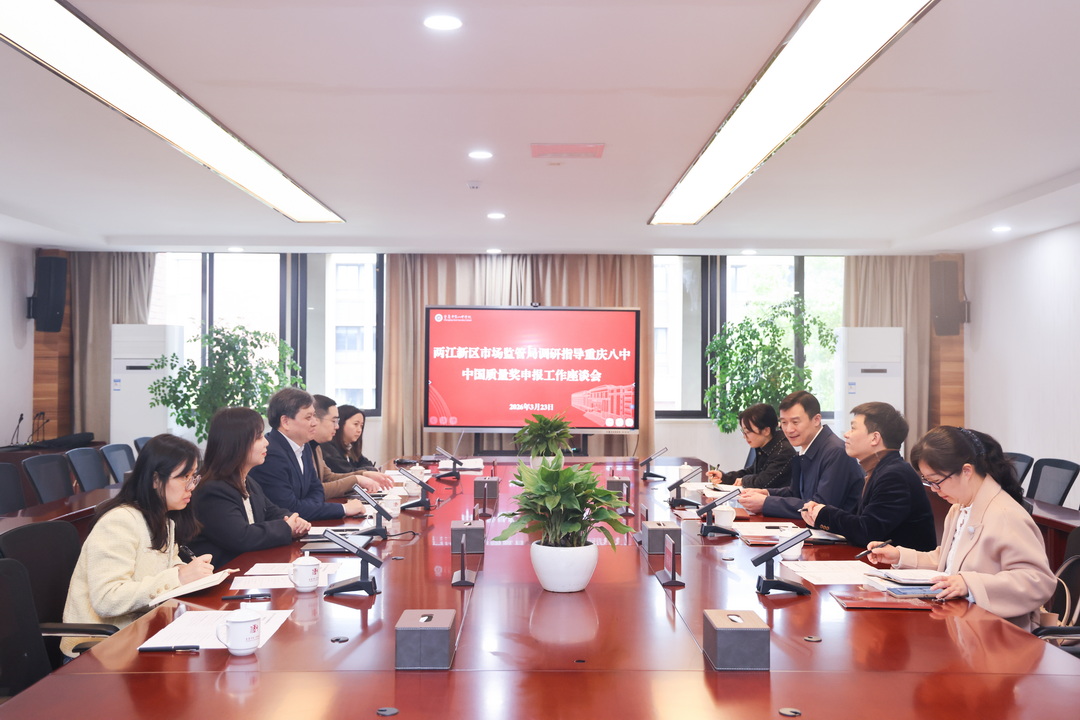 2026年3月24日,两江新区市场监管局副局长周兵,质量发展科科长冯敦峰、质量发展科副科长熊欣,原渝北区市场监管局质量科科长李川豫莅临我校调研。我校党委书记周迎春、行政办公室副主任刘凯、行政办公室副主任赵心怡及行政办公室相关工作人员进行了接待。