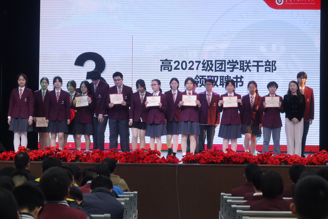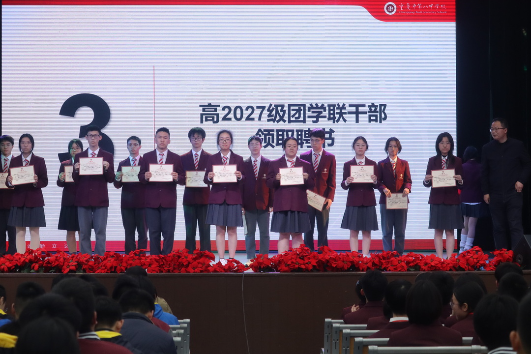 授聘书环节,重庆八中副校长梅家烨老师宣读聘书决定。随后重庆八中高2028届年级组长王舟老师、重庆八中学生处主任罗来莉老师以及重庆八中副校长梅家烨老师为高2027届团学联学生干部颁发聘书,对过往一年团学联学生干部的工作表示了认可与肯定。