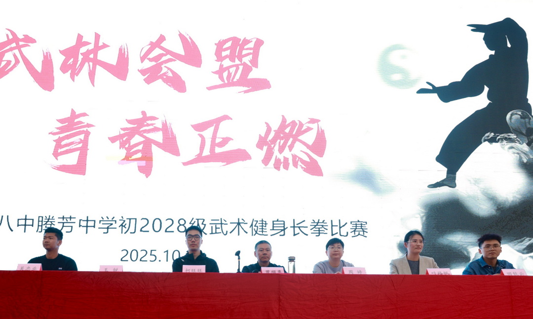 2025年10月24日下午,重庆八中腾芳中学田径场上旌旗招展,喝彩震天。以“武林会盟,青春正燃”为主题的初2028级武术健身长拳比赛在秋日桂香中隆重举行。初二年级的同学以精湛的五步拳表演拉开赛事序幕,全体初一年级学子随后以武会友,尽显腾芳少年的蓬勃朝气与刚健风骨。