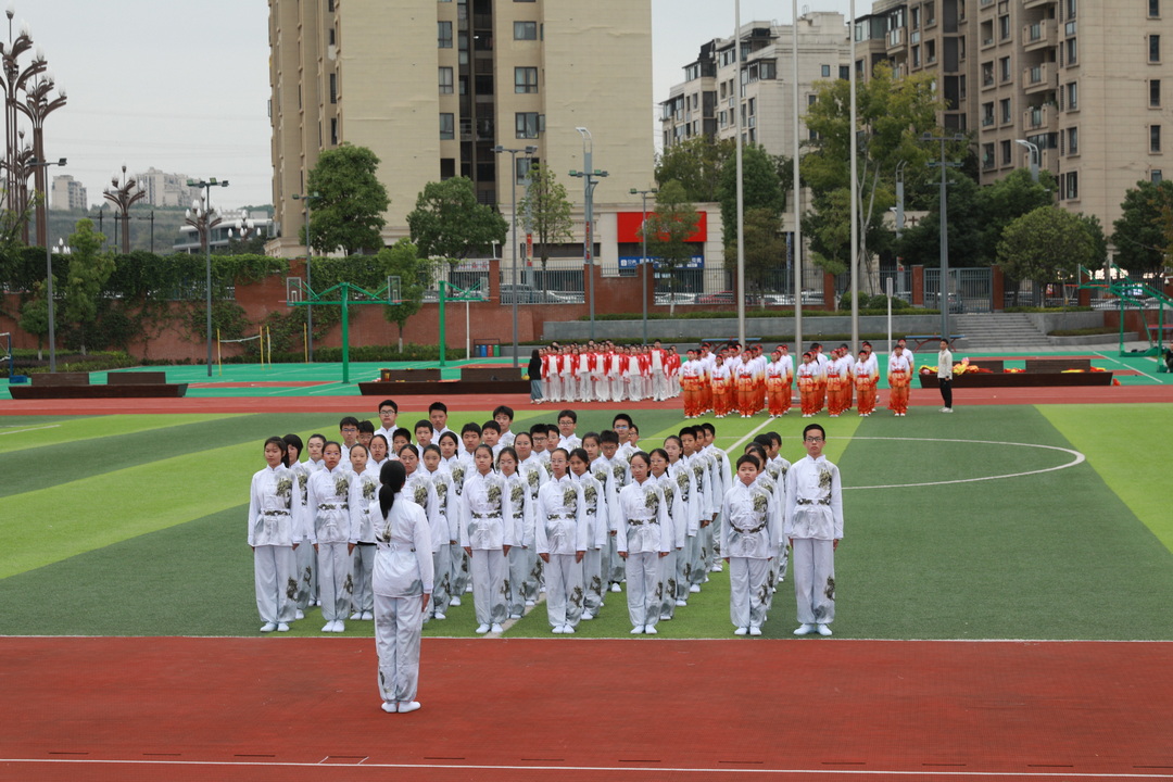 2025年10月24日下午,重庆八中腾芳中学田径场上旌旗招展,喝彩震天。以“武林会盟,青春正燃”为主题的初2028级武术健身长拳比赛在秋日桂香中隆重举行。初二年级的同学以精湛的五步拳表演拉开赛事序幕,全体初一年级学子随后以武会友,尽显腾芳少年的蓬勃朝气与刚健风骨。