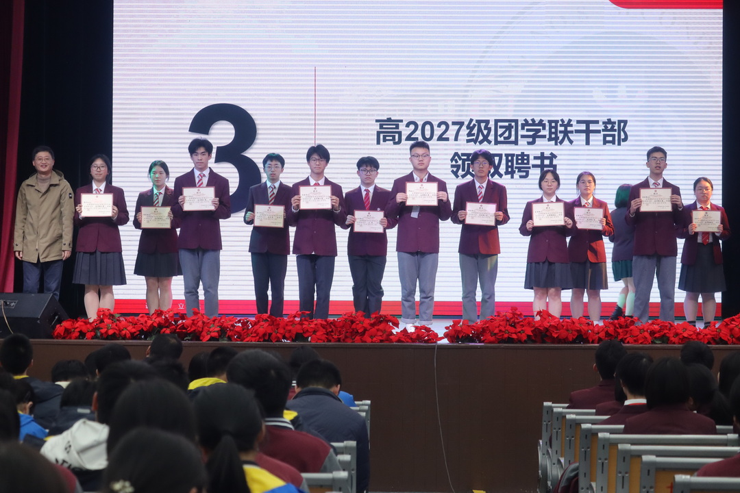 授聘书环节,重庆八中副校长梅家烨老师宣读聘书决定。随后重庆八中高2028届年级组长王舟老师、重庆八中学生处主任罗来莉老师以及重庆八中副校长梅家烨老师为高2027届团学联学生干部颁发聘书,对过往一年团学联学生干部的工作表示了认可与肯定。