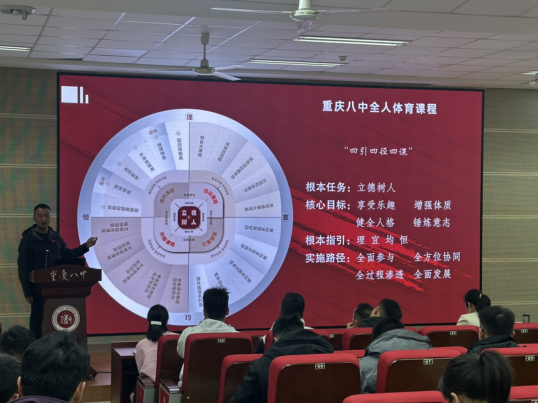 随后,重庆八中体卫处副主任吕舟以《坚守健康第一 践行立德树人——重庆八中学生体质健康提升行动路径解读》为题,作专题汇报。汇报紧密结合国家体育教育政策要求与八中“全人体育”课程理念,从体育课程的“认识与思考”“策略与任务”“目标与分析”“措施与步骤”四个维度,系统阐述了学生体质健康提升的具体路径,既有理论高度,又有实践指导意义,为各校区落实体育课程教学、提升学生体质健康水平提供了清晰方案与明确要求,进一步完善了集团“全人”体育课程体系的实践路径。