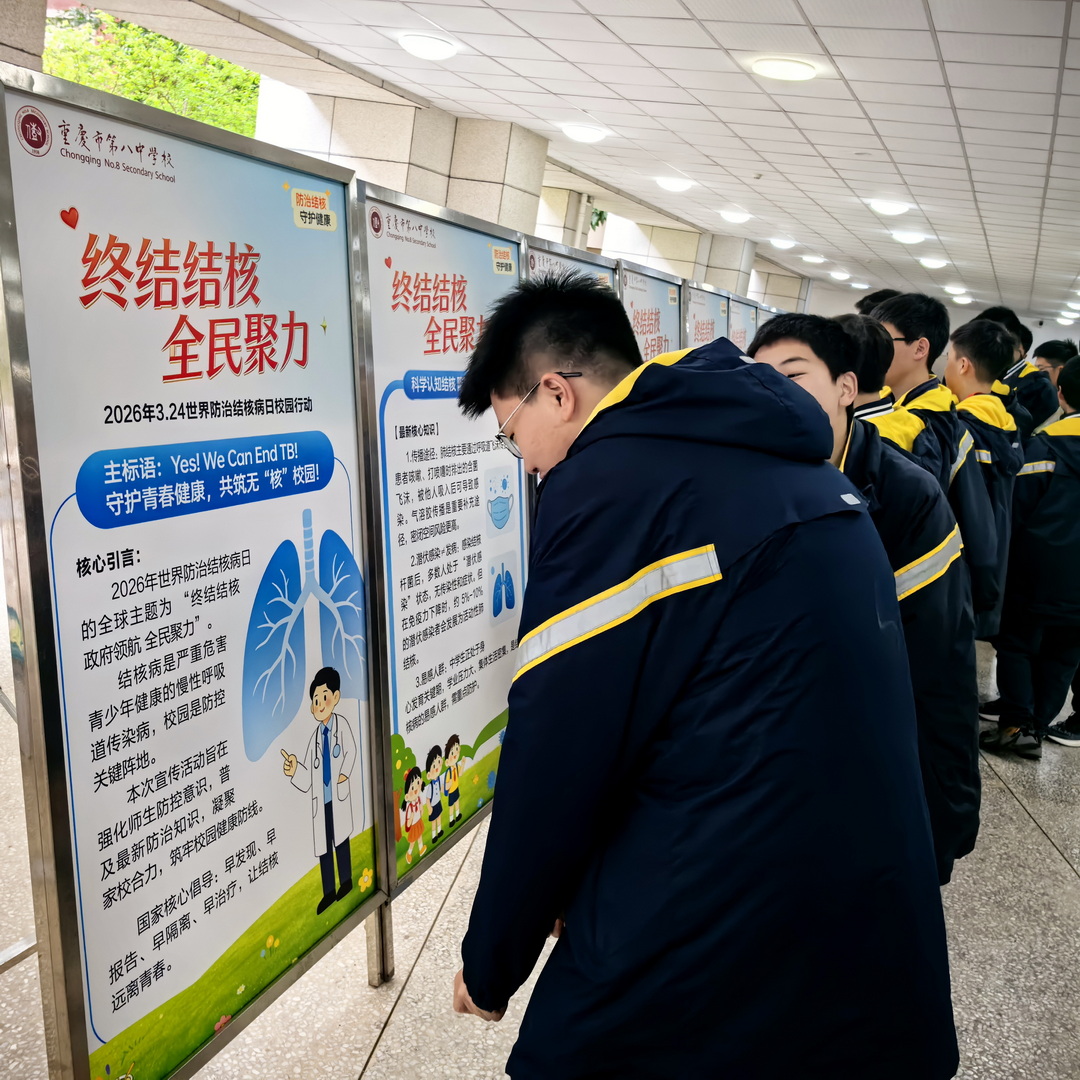 为迎接第31个“世界防治结核病日”,进一步筑牢校园公共卫生安全防线,强化全体师生结核病防控意识,提升结核病防治知识知晓率,引导青少年树立健康防护理念,2026年3月24日,重庆八中教育集团各校区结合“全面行动 全力投入 全民参与 终结结核”的主题,精心开展结核病防治科普宣传活动,系统学习结核防治相关知识,让健康理念浸润校园每一个角落。