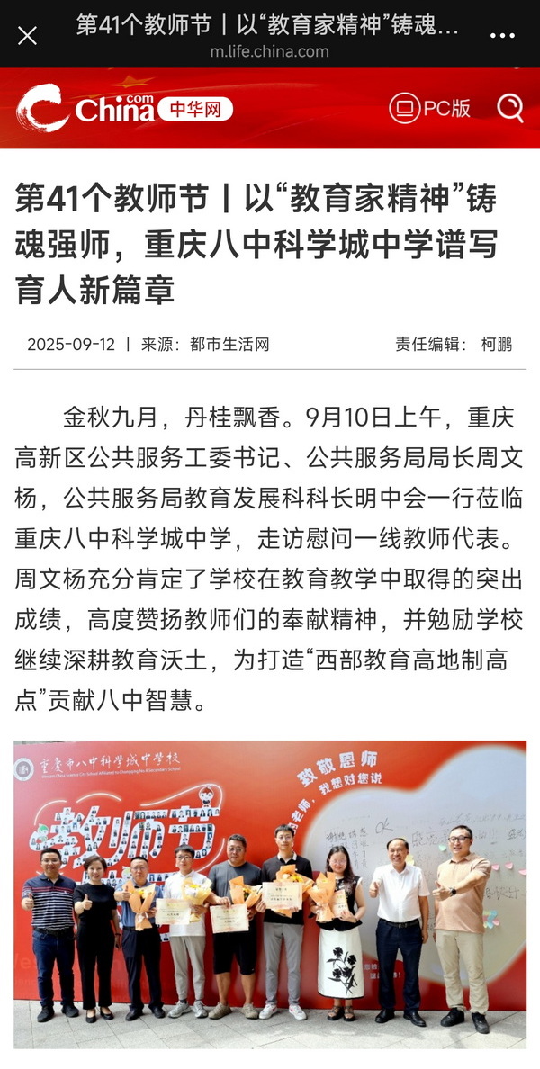 重庆八中副校长、重庆八中科学城中学党委书记曾奇表示,深耕八科育人答卷,作为重庆八中教育集团的核心成员,重庆八中科学城中学始终以“教育家精神”为引领,坚持“品质、品位、品格”的“三品”办学主张。学校教师团队以专业为基、以真心为壤,不断突破知识边界,拓展课堂广度。老师们尊重学生差异,坚持“进步教育”与“全面发展”并重,关注学生全面和可持续发展,用精准教育激发潜能;坚守教育传统的同时,以创新智慧赋能课堂,让教育在传承中焕发新生机。正如教师代表所言:“我们以日复一日的坚守,书写育人答卷;用教育的温度与厚度,助力学生逐梦未来。”(薛成毅)