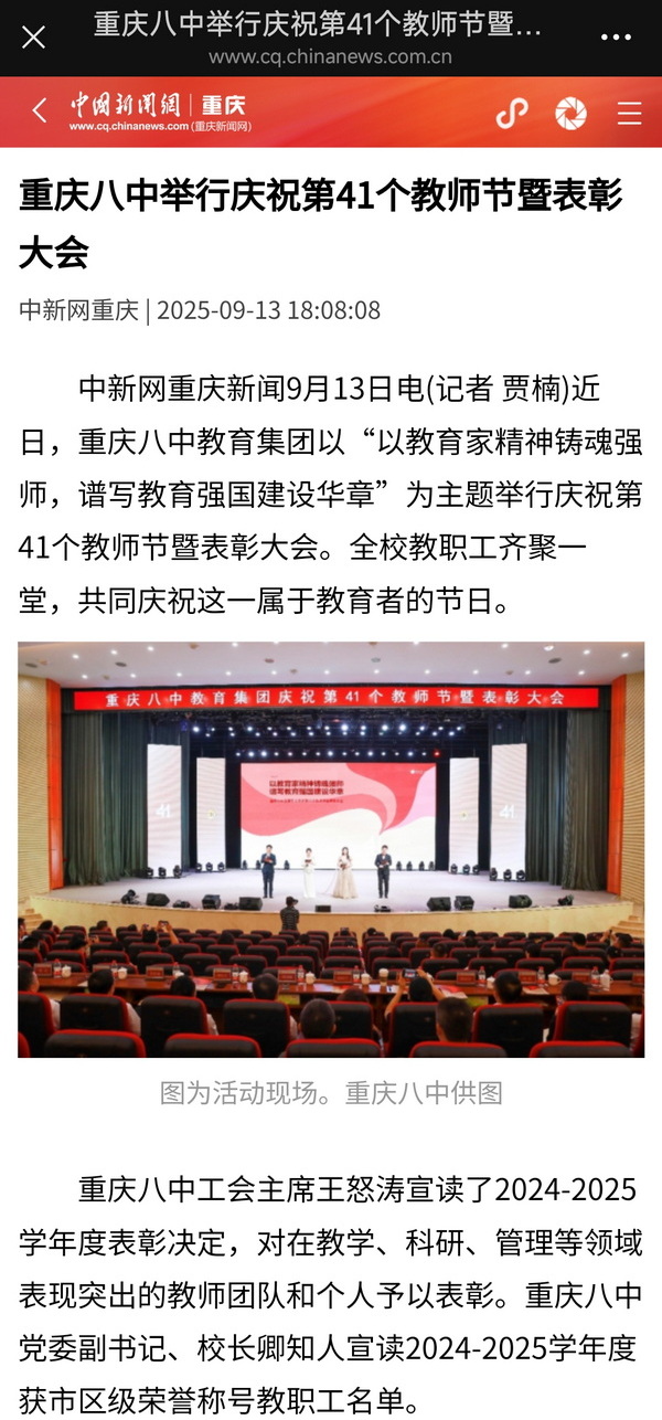 中国新闻网——重庆八中举行庆祝第41个教师节暨表彰大会