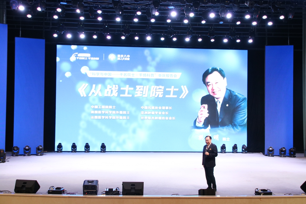 第1眼TV-华龙网讯(杨丽媛)金秋九月,丹桂馥郁。9月30日上午,重庆八中渝北校区迎来了一场思想与灵魂的深刻碰撞。作为“科学与中国——千名院士·千场科普”系列活动的重要一站,中国工程院院士、中国抗癌协会理事长樊代明院士回到家乡重庆,以《从战士到院士》为题,为师生带来了一场感人至深、启迪心智的专题讲座。重庆市科协、重庆大学附属肿瘤医院、渝北区教委等相关单位领导以及八中师生代表共同参加了本次活动。