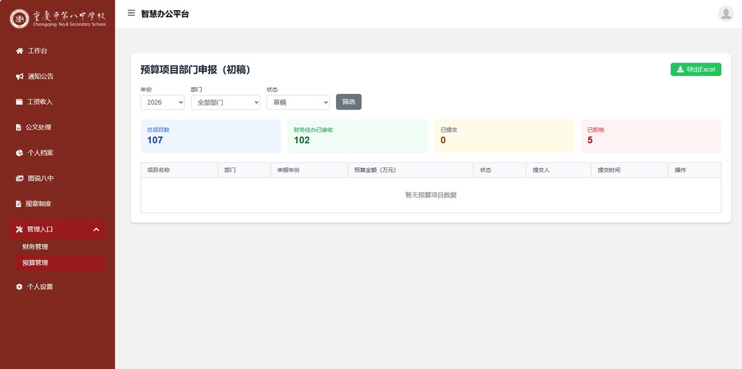预算管理功能为各部门提供便捷、高效的线上申报渠道。各部门工作人员只需登录OA账号,即可进入专属申报界面,按照系统提示规范填写相关内容。同时,该模块还具备强大的数据管理功能,可实时在线接收各部门提交的预算表,汇总一键导出所有表单,极大缩短了预算表收集、整理的时间。