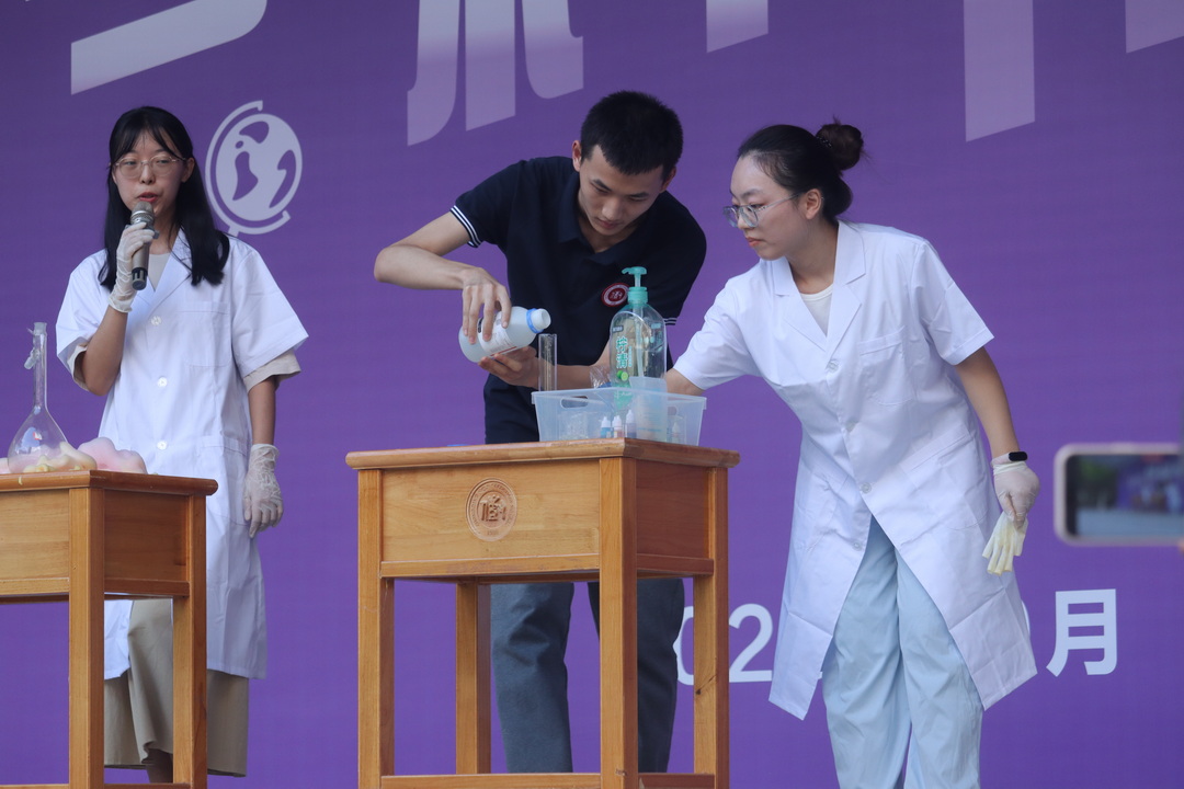 在化学学科展区,同学们利用矿泉水瓶、吸管、橡皮筋等日常物品,设计出各种兼具科学性,安全性与创意性的化学实验装置,全方位锻炼了科学探究与创新意识,完成从知识的接受者,到知识的主动探索者和应用者的转变。