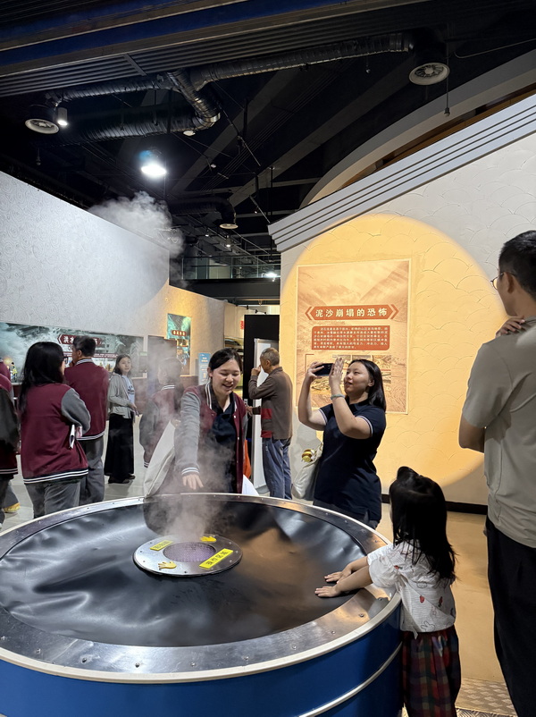 经典展项同样为同学们带来惊喜体验。“生命的河流”展区中,同学们通过“水旋涡”演示理解自然循环,在拨动“水弦琴”的过程中感受科学与艺术的共鸣;“汽车模拟驾驶”融入重庆地标元素,配合先进气压传动系统,让大家真切体验到山城驾驶的独特魅力;而应用UE5建模与动感液压平台的“灾害模拟器”,则通过5D座椅的升降俯冲与4K视听环绕,营造出身临其境的防灾科普场景。丰富的互动设计打破了传统科普的静态壁垒,让科学知识在动手实践中自然渗透。