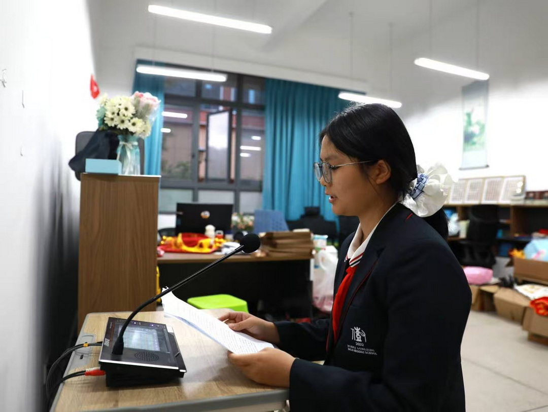 学生代表程心悦同学在国旗下发表了题为《强国有我,以“惜粮之心”筑“求学之路”》的演讲。她从“谁知盘中餐,粒粒皆辛苦”这句诗出发,深入浅出地阐述了节约粮食与国家发展、民族复兴之间的紧密联系,呼吁同学们从自身做起,珍惜每一粒粮食,将“光盘行动”融入日常生活中,用实际行动践行“强国有我”的青春誓言。