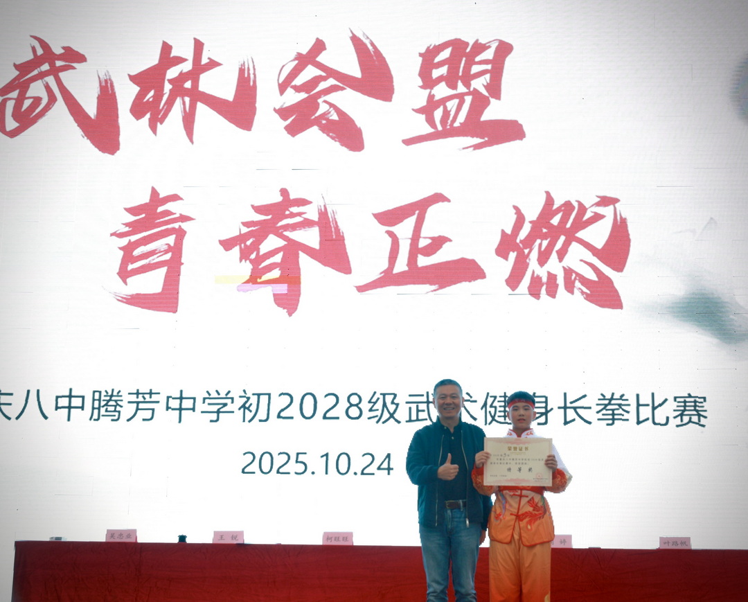 2025年10月24日下午,重庆八中腾芳中学田径场上旌旗招展,喝彩震天。以“武林会盟,青春正燃”为主题的初2028级武术健身长拳比赛在秋日桂香中隆重举行。初二年级的同学以精湛的五步拳表演拉开赛事序幕,全体初一年级学子随后以武会友,尽显腾芳少年的蓬勃朝气与刚健风骨。