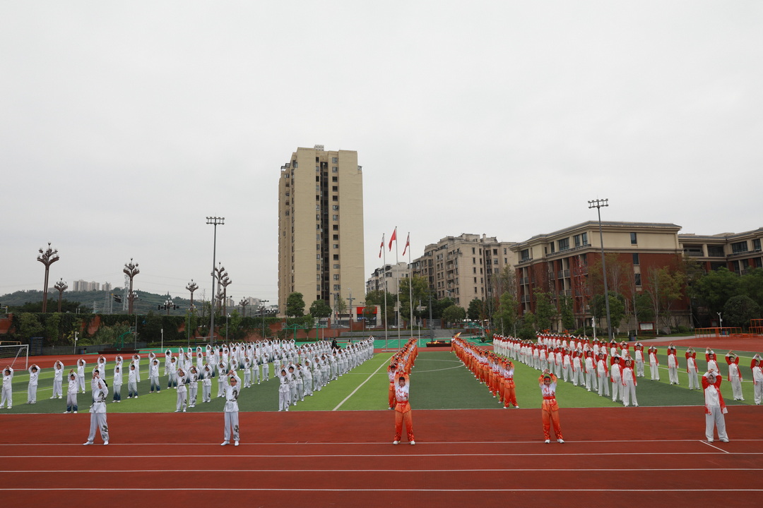 2025年10月24日下午,重庆八中腾芳中学田径场上旌旗招展,喝彩震天。以“武林会盟,青春正燃”为主题的初2028级武术健身长拳比赛在秋日桂香中隆重举行。初二年级的同学以精湛的五步拳表演拉开赛事序幕,全体初一年级学子随后以武会友,尽显腾芳少年的蓬勃朝气与刚健风骨。