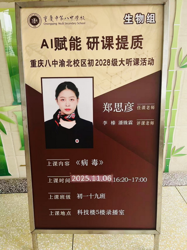 2025年11月6日,重庆八中初2028届所有教师共同观摩了生物组郑思彦老师的《病毒》公开课,该课程以“AI赋能生物学教学”为核心,为全体老师提供了丰富的AI应用参考。郑思彦老师以科学史中经典的“烟草花叶病”实验为锚点,借助人工智能技术重构课堂形态,引导学生通过小组合作重演科学家的探究历程,在沉浸式体验中培养科学思维与实证精神,为在场观摩教师带来了一场兼具知识性与创新性的教学示范。