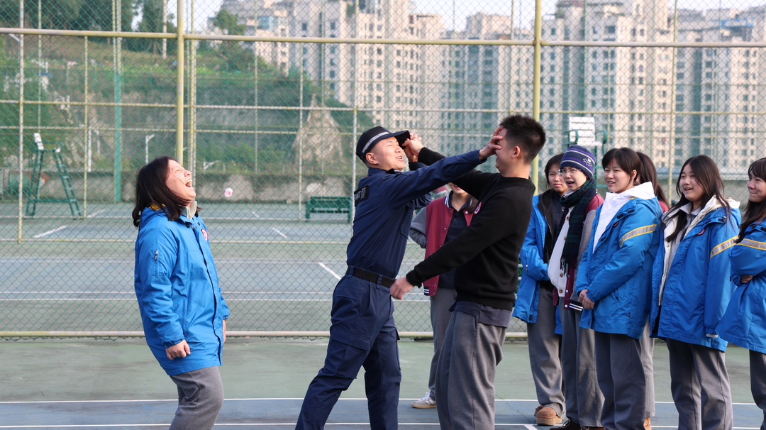 在随后开展的室外实战训练环节中,阳光明媚、微风轻柔,同学们在操场上跟随特警进行徒手防卫、基础急救技术、AED使用要点、情景模拟应对等多项实践训练。警官们手把手示范要领,学生们分组练习,在一次次实操中提升了警觉性与身体反应能力。许多同学表示:“第一次觉得自我保护能力是可以通过训练真正掌握的。”
