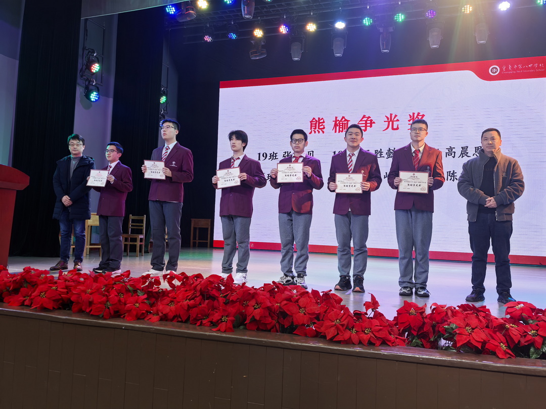 表彰活动分多轮进行。获得“熊榆争光奖”的是张加贝、王胜懿、高晨恩、张涵峤、谭正屹、陈宇坤、叶凌僖、陈柯霖、胡苏寒、钟杨振飞、周梓涵、李芸可、杨娇等同学,重庆八中高2026届党支部书记刘钊老师作、高2026届年级组长范兴波老师受邀为同学们颁奖。