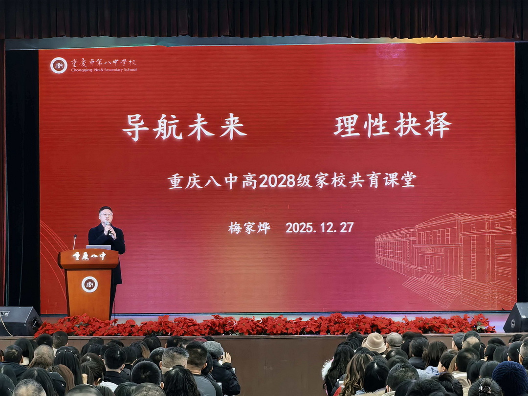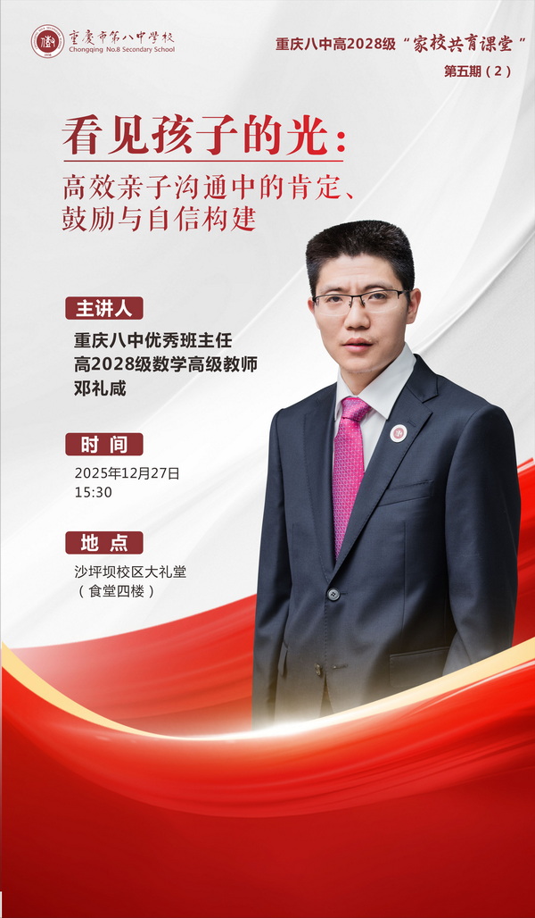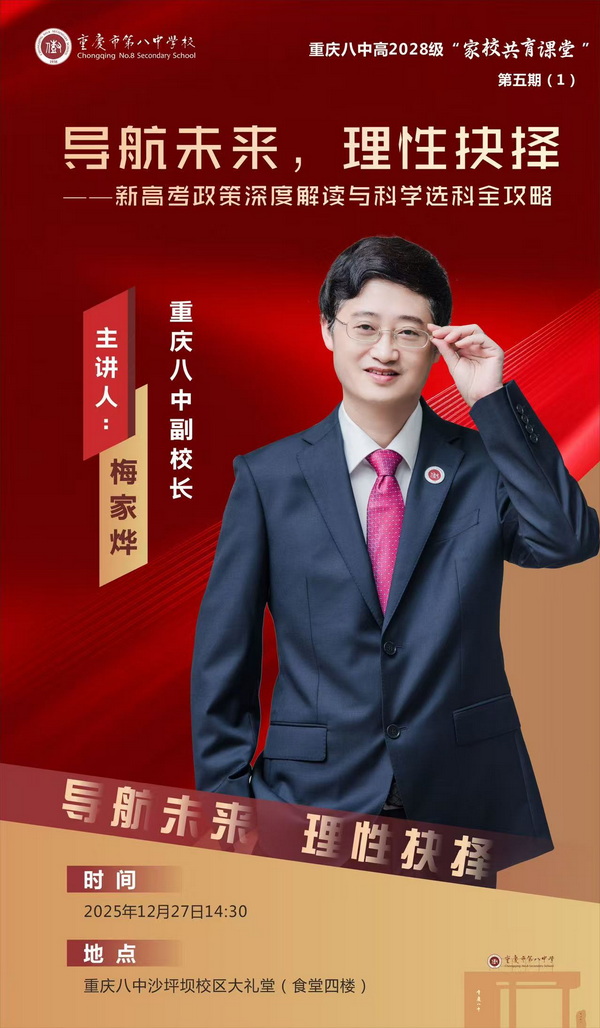 2025年12月27日,重庆八中沙坪坝校区高一年级举办了第5期“家校共育课堂”活动。本次课堂聚焦“新高考政策解读”和“看见孩子的光”两大主题,分别由重庆八中副校长梅家烨老师和重庆八中优秀班主任、高级教师邓礼咸老师担任主讲人。