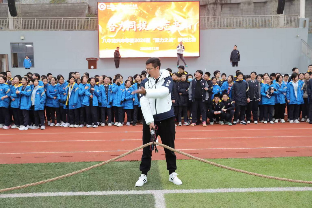 1月16日下午,八中龙兴中学田径运动场人声鼎沸,初2026届“聚力之战”拔河比赛火热开赛。500余名师生以绳为媒,在呐喊与汗水中诠释团结的力量。