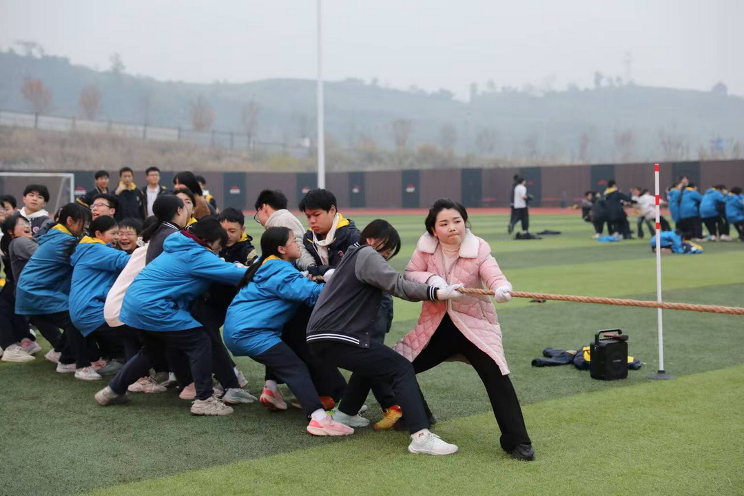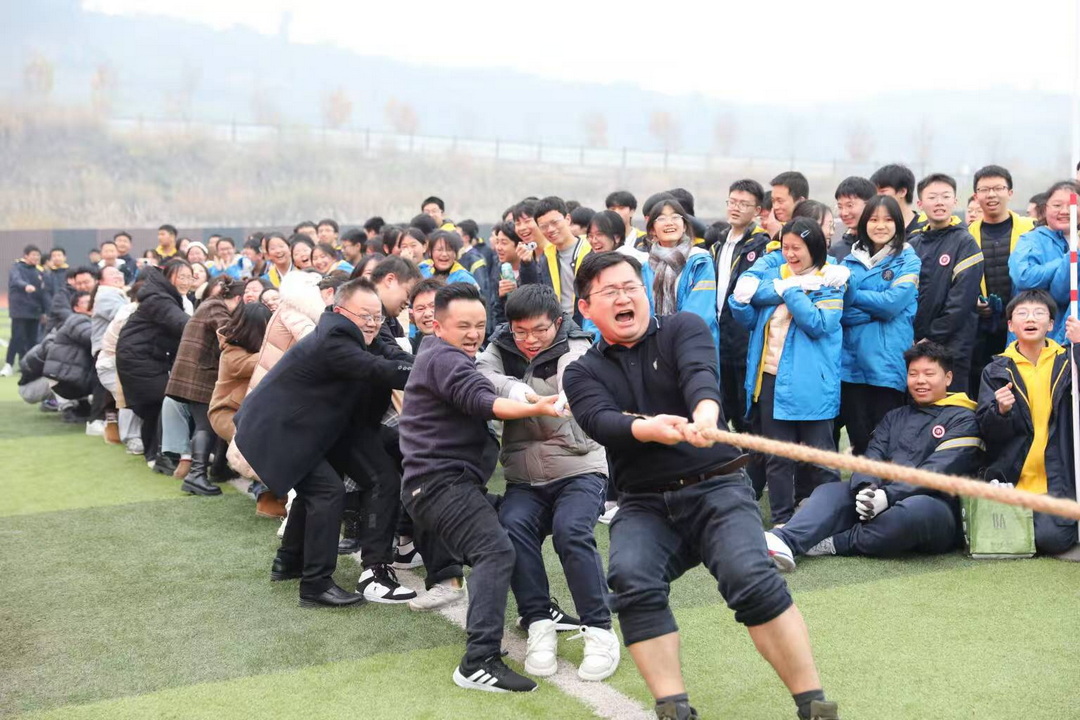 冬日的夕阳为运动场镀上一层金辉,大家冻红的双手因用力而微微颤抖,却仍死死攥住绳索。啦啦队中,有人举着自制的加油牌蹦跳欢呼,有人扯着嗓子喊到声嘶力竭,甚至有班级自发组成“后勤小队”,为选手递水、揉肩、加油打气。当十班最终夺冠的哨声响起,全场爆发出雷鸣般的掌声,队员们相拥庆祝,班主任被围在中间,这一刻,胜负已不再重要,班级的荣誉感与归属感在每个人心中升腾。