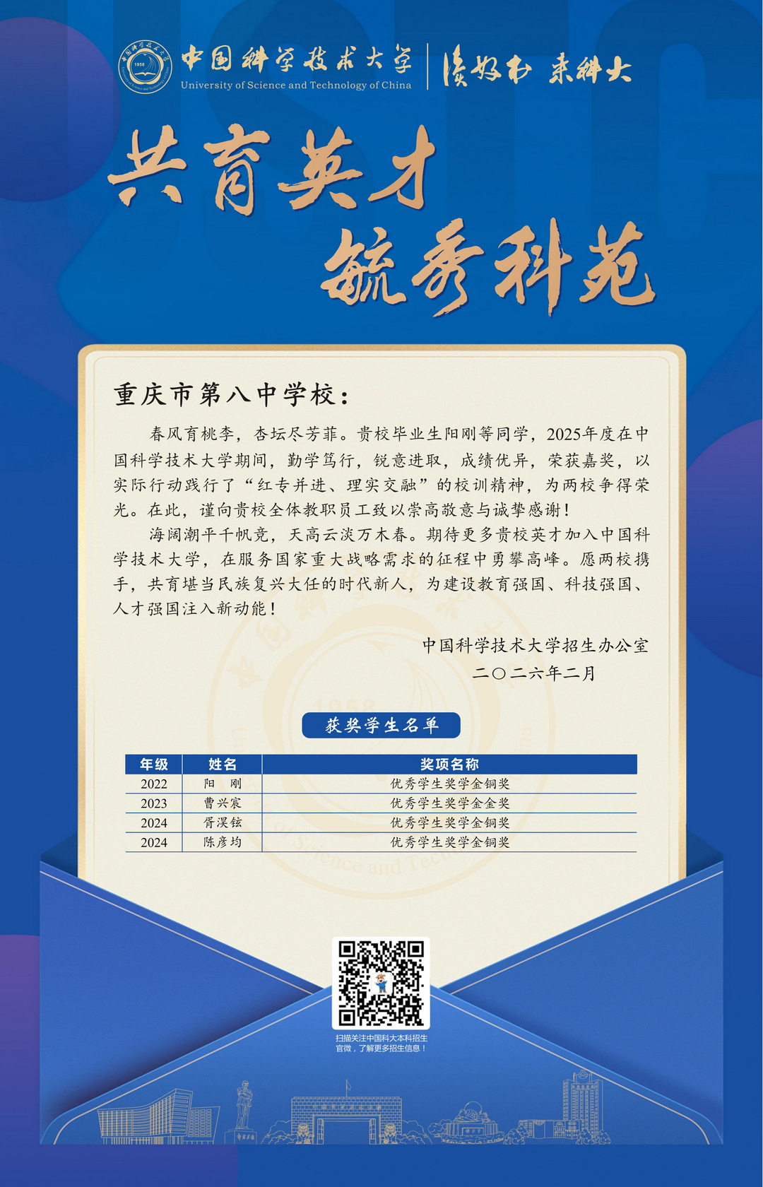 中国科学技术大学向我校发来喜报,祝贺我校优秀毕业生阳刚等同学在中科大学习期间勤学笃行、成绩优异,荣获嘉奖,以实际行动践行“红专并进、理实交融”的校训精神,为两校增光添彩。愿更多优秀学子圆梦中科大,在服务国家重大战略需求中勇攀高峰。