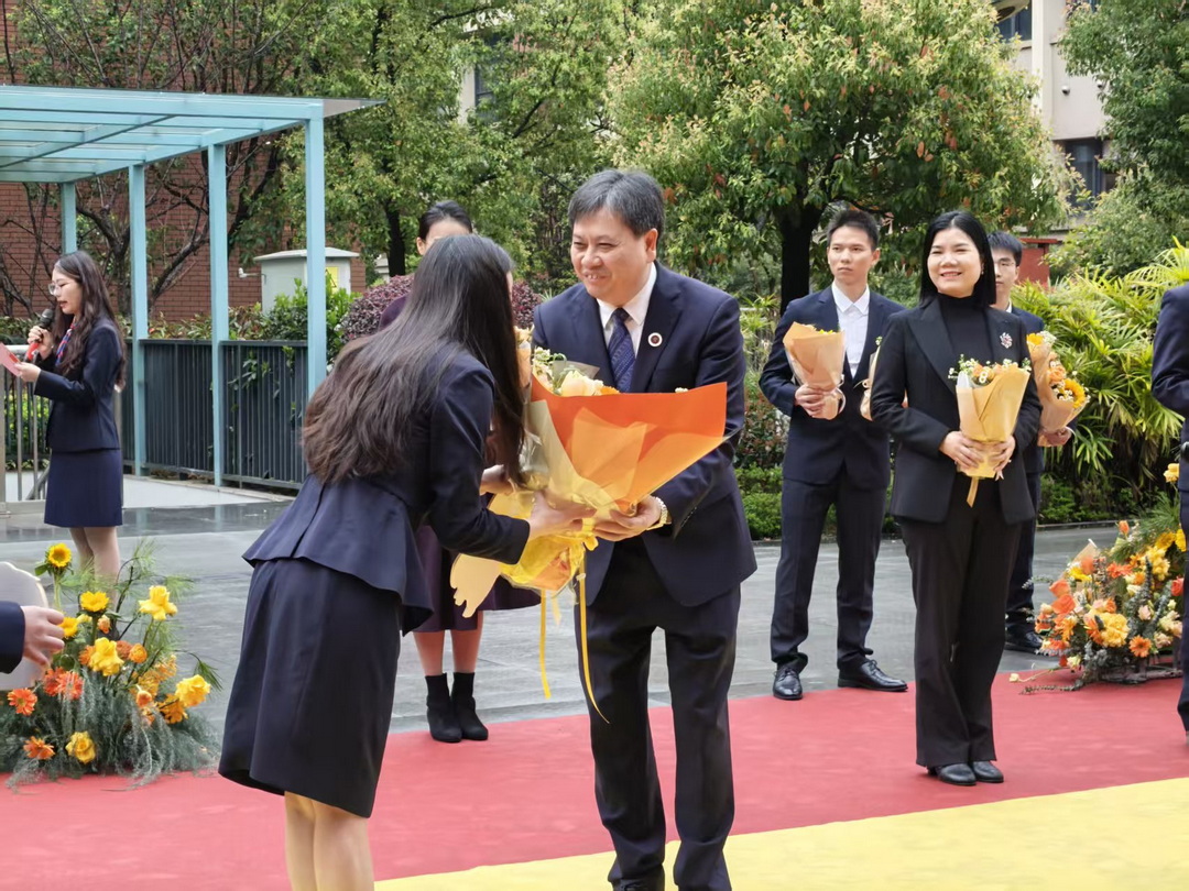 在红毯的终点处,重庆八中校长周迎春等学校领导和初三全体教师列队迎接,与每一位走过来的学生击掌、拥抱,送上祝福。就在这个时刻,周迎春校长手持一束束精心准备的鲜花,缓缓走向初三班主任队伍。“你们辛苦了!”周迎春校长依次为每一位初三班主任献上鲜花,并与他们亲切握手、合影留念。鲜花映衬着老师们欣慰的笑容,掌声与欢呼声此起彼伏,将红毯仪式的氛围推向高潮。