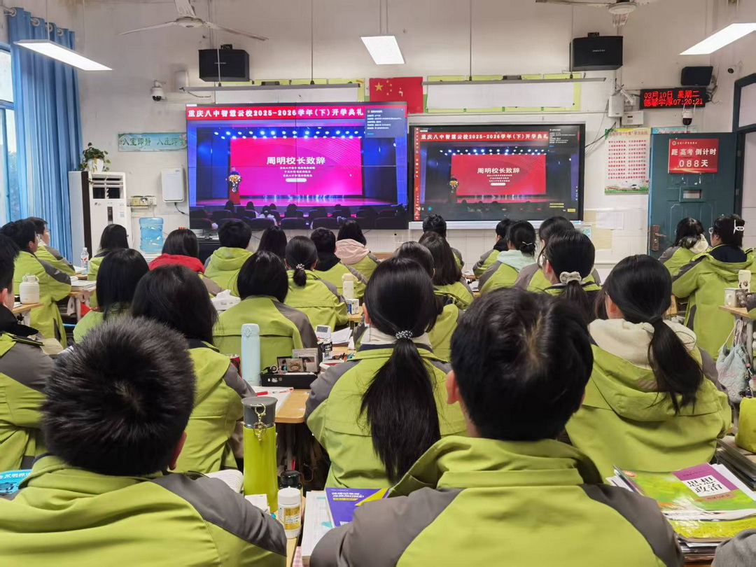 3月10日,“奋楫扬帆·逐梦新程”重庆八中智慧云校2025-2026(下)学期开学典礼在重庆八中树人堂举行,云校学子逾五万人在线同步观看。重庆八中教育集团校长助理、校区副校长、云校校长周明,重庆八中三创班班主任、高2027届英语主讲老师白亭出席典礼。