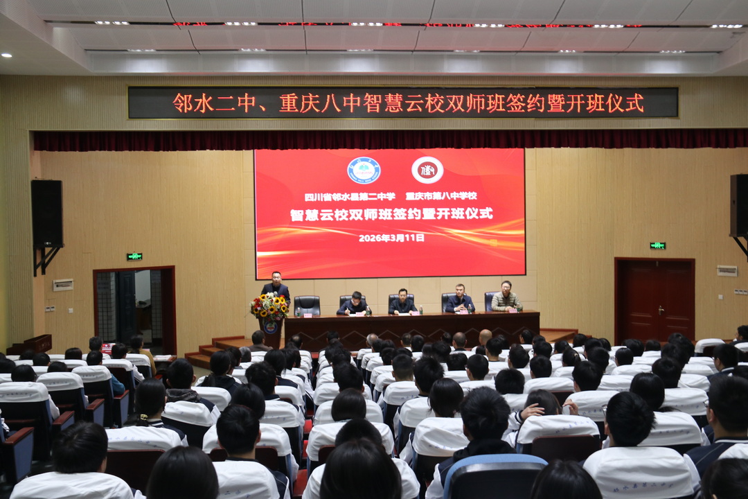 3月11日,重庆八中与邻水二中融合教育共建学校签约仪式在邻水二中隆重举行。邻水县教育科技和体育局党组书记、局长袁皓,邻水二中党委书记周胜军,重庆八中教育集团校长助理、校区副校长、云校校长周明,云校副校长屈国栋等出席本次活动。