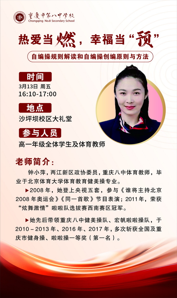 为深入贯彻“健康第一”的教育理念,落实五育并举、促进学生全面发展的育人要求,切实落实自编操比赛规程,夯实高一年级学生自编操创编基础、提升作品质量与竞技水平,3月13日下午,重庆市第八中学校沙坪坝校区大礼堂内暖意涌动、活力满满,“自编操规则解读和创编原则与方法”专题培训顺利落幕。本次培训由学校优秀体育教师钟小萍主讲,高一年级全体学生及体育教师齐聚一堂,共学创编技巧,共赴青春盛会,以体育之力滋养少年成长,以创意之美赋能全面发展。