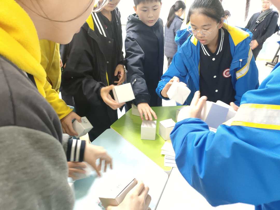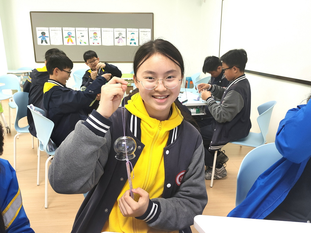 在核心创作环节,学生依次完成了“心情风铃”的各个部分。他们首先在长条形卡片上写下自己曾经历的积极情绪体验,将温暖的记忆转化为可视化的文字;随后,在谢老师的现场演示与同伴互助中,学生们折叠出一只只小巧的千纸鹤,承载着新学期的心愿与期许。最后,学生在透明的玻璃罩上自由绘制代表“开心与幸福”的图案——太阳、云朵、笑脸、问号……每一笔都是内心情绪的具身表达。所有的作品通过细绳串联成风铃,成为“独立个体,共同发声”的象征。