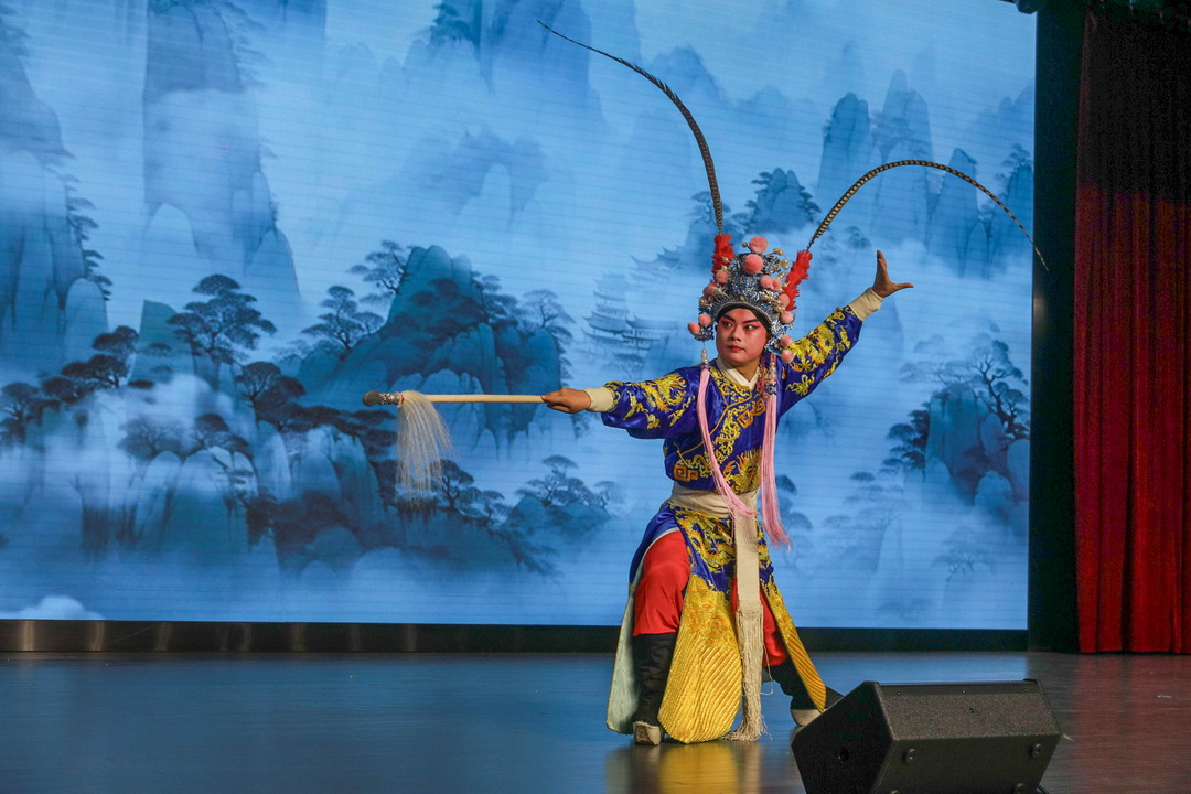随后,活动进入经典片段赏析环节。《别洞观景》灵动飘逸,演员翎子轻扬、身段柔美,念白清脆灵动,将白鳝仙姑的天真烂漫与灵动娇俏演绎得淋漓尽致,只一颦一笑、一步一姿,便让同学们深深沉醉于川剧独有的韵味与魅力之中;《八阵图》惊险武打更是将生角之刚的翻滚腾挪演绎得淋漓尽致,那眉宇间藏不住的英气是困境中难掩的焦灼与坚韧;川剧变脸惊喜奇幻,演员指尖轻挥、身形一转,一张张脸谱瞬息变换,行云流水、神秘莫测。现场掌声、欢呼声、惊叹声此起彼伏,同学们目不转睛,真切地感受到非遗技艺的神奇与震撼。一幕幕经典戏曲选段的演出,让同学们沉浸在传统艺术的视听盛宴中。演员老师们精湛的技艺,无论是婉转的唱腔、优美的身段,还是刚劲有力的武打场面,都赢得了同学们阵阵热烈的掌声。