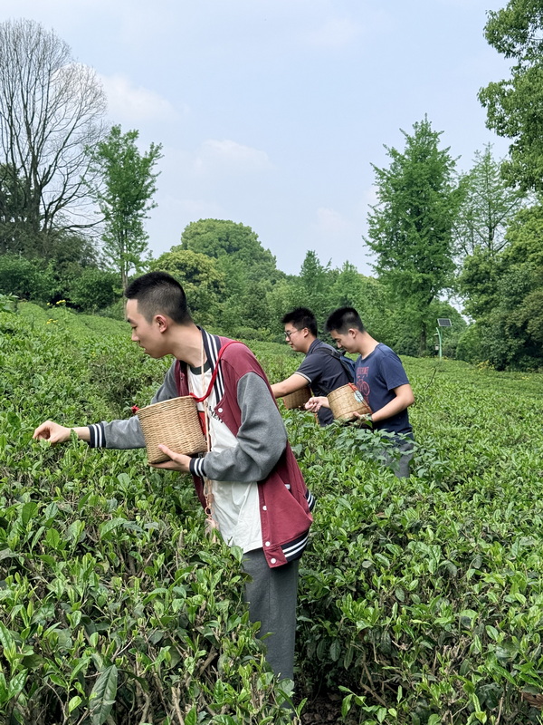 在采茶环节,同学们身着统一服装,手持采茶篮,在茶农的指导下学习采茶技艺。大家穿梭在茶树间,一边感受春日自然的馈赠,一边交流采茶心得。采摘结束后,同学们移步制茶体验区,在制茶师傅的带领下,依次体验了萎凋、杀青、揉捻、干燥等茶叶制作工序,在实践中体会到“一叶成茶”的不易,也对“精益求精”的工匠精神有了更深刻的理解。