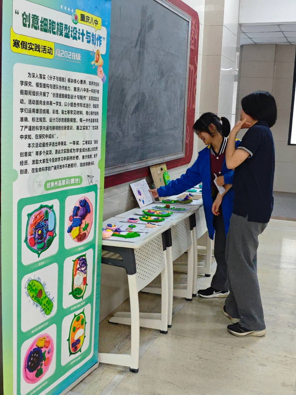 为深入落实《分子与细胞》模块核心素养,培养学生科学探究、模型建构与团队协作能力,重庆八中高一年级于寒假期间组织开展了“创意细胞模型设计与制作”主题实践活动。活动面向全体高一学生,以小组合作形式进行,鼓励同学们运用废旧纸箱、彩线、黏土等常见材料,精心制作结构准确、标注规范、设计巧妙的细胞模型。每一件作品都体现了严谨的科学内涵与鲜明的创新意识,真正实现了“在实践中求知,在探究中成长”。