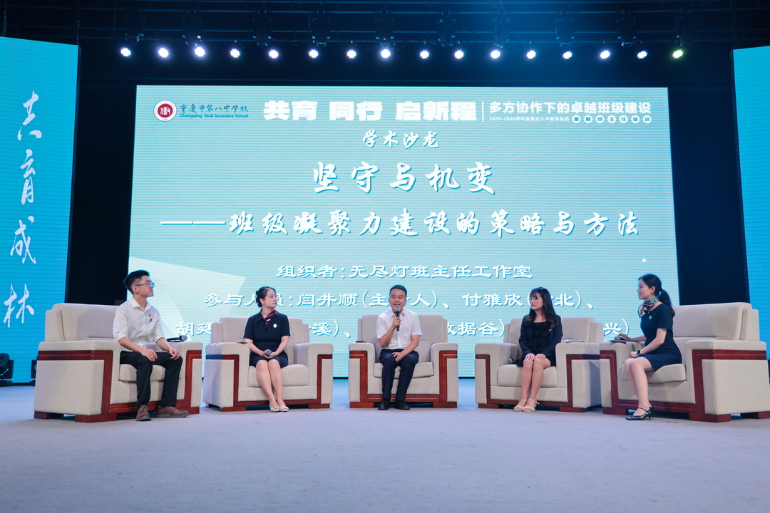 紧接其后,由无尽灯班主任工作室带来的学术沙龙《坚守与机变——班级凝聚力建设的策略与方法》精彩上演。工作室主持人闫井顺老师携付雅欣、周轲研、胡廷娜、毛伟四位成员,从不同角度分享了实战智慧。渝北校区付雅欣老师以“规以立序,爱以化人”为核心,阐述了如何通过动态更新、奖惩同步的班规建立秩序,并通过转化错误、借力家长等活动建立情感纽带。数据谷中学周轲研老师则聚焦“让每个孩子都闪亮”,分享了通过创设“特色班委”和“项目制岗位”,发现并放大每一个学生的闪光点,从而增强班级认同感的创新实践。八中两江中学胡廷娜老师生动地阐述了如何“打造有根有魂有趣的班级文化”,通过提炼班级精神、创设“每周一夸”等仪式感活动以及让文化墙“活”起来等方式,让文化成为凝聚班级的灵魂。最后,八中龙兴中学毛伟老师独辟蹊径,探讨了如何“巧用班级冲突”,通过坚守人格尊严、程序正义和集体信仰,并将冲突转化为教育资源,最终实现“微局共生”,锻造班级凝聚力。