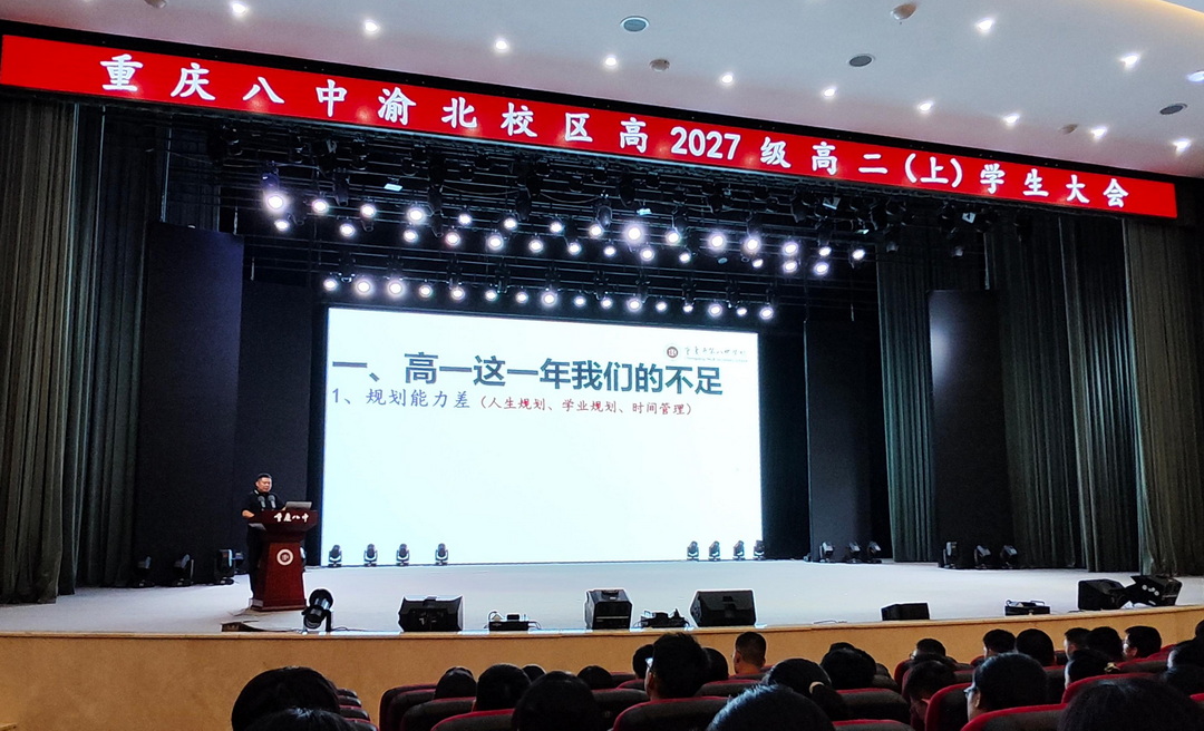 2025年8月30日下午,重庆八中渝北校区高2027届高二上学期学生大会在学校大礼堂隆重举行。本次大会以“不念过往,不畏将来”为主题,由年级主任张诗文老师主讲,全体高二学生及班主任参加会议。