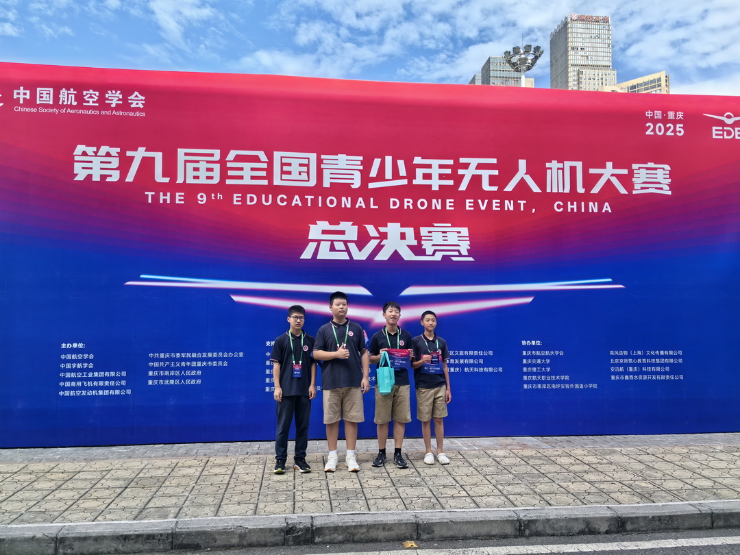 经过前期第九届全国青少年无人机大赛重庆市赛的层层选拔,我校初一年级5名优秀学子脱颖而出,代表重庆市征战全国总决赛。在学校领导及各部门的深切关怀与支持下,在裴博文老师的悉心指导下,参赛学生赛前刻苦训练、精益求精;赛场上沉着冷静、默契配合、全力拼搏,充分展现了八中学子扎实的科技素养与昂扬的精神风貌。