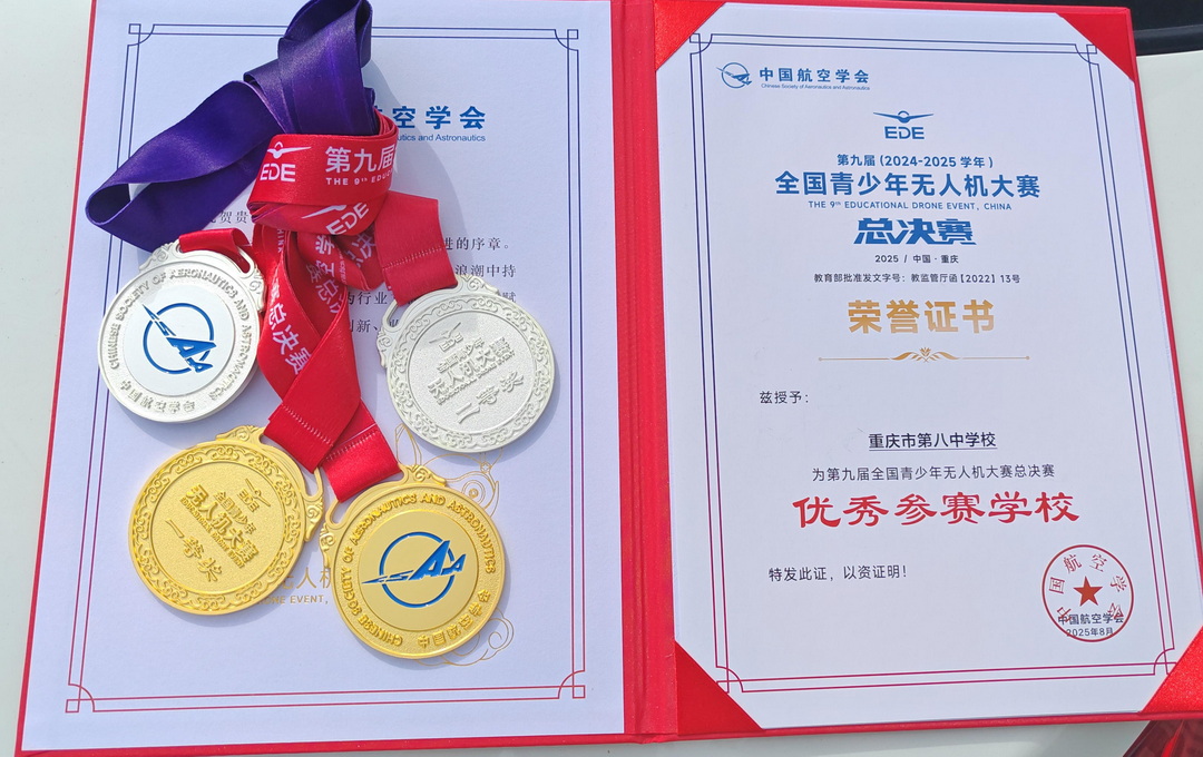 此次优异成绩的取得,不仅是同学们日复一日勤学苦练的成果,更是我校坚持科学教育特色、注重创新人才培养的生动体现。凭借出色的组织工作和优异的竞赛成绩,重庆八中被中国航空学会授予“优秀参赛学校”荣誉称号,充分彰显了学校在青少年航空航天科技教育领域的领先地位。